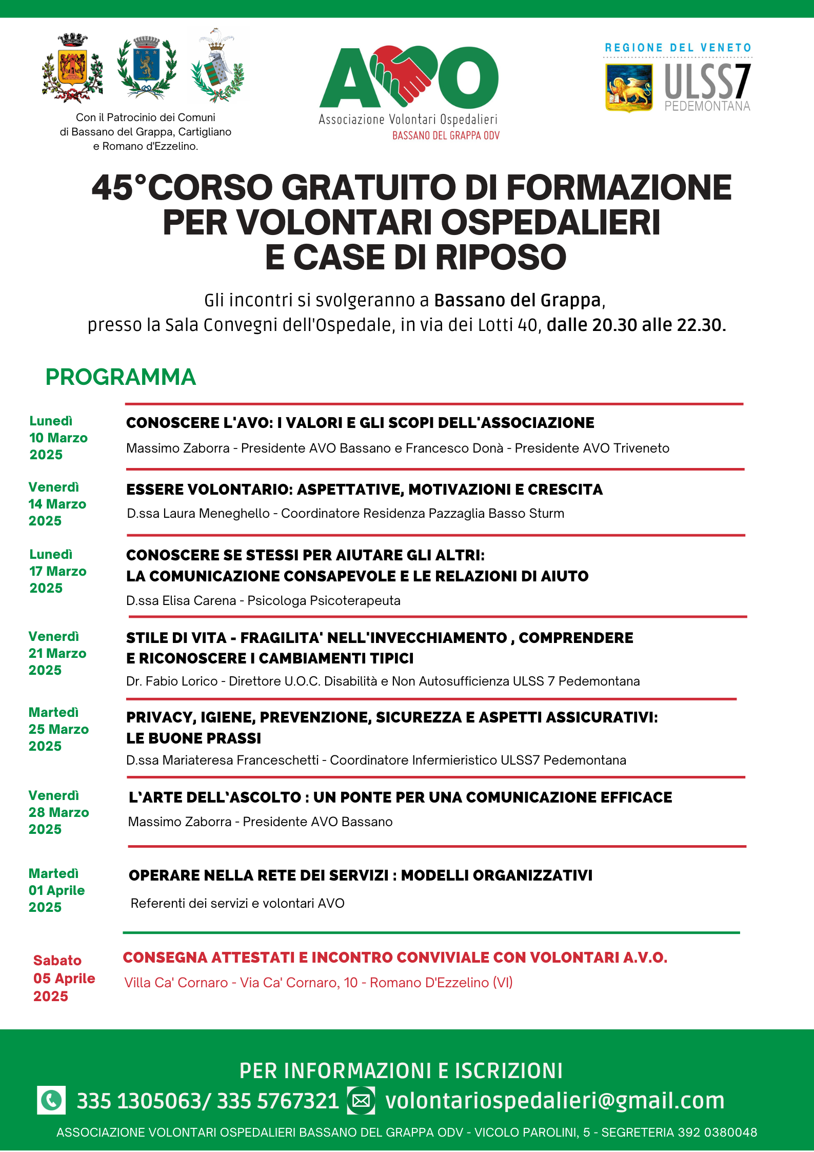 45° CORSO GRATUITO DI FORMAZIONE PER VOLONTARI OSPEDALIERI E CASE DI RIPOSO