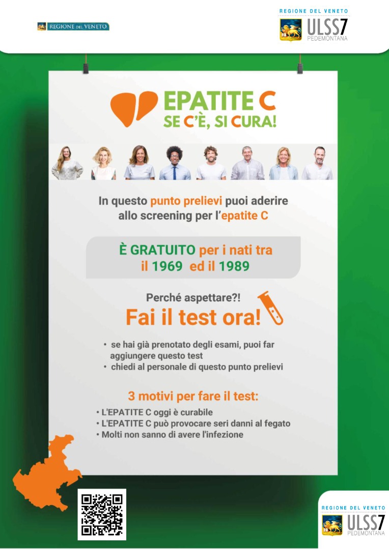 La Regione del Veneto promuove la realizzazione di uno screening per l’epatite C totalmente gratuito. Lo screening è destinato a tutte le persone nate tra il 1969 e il 1989 e ad alcune popolazioni selezionate, quali i soggetti seguiti dai Servizi per le Dipendenze ed i detenuti . Gli obiettivi dello screening per epatite C sono molteplici. In primo luogo rilevare le infezioni da HCV ancora non diagnosticate e garantire la possibilità di un trattamento farmacologico precoce e altamente efficace. Un altro intento è quello di interrompere la circolazione del virus impedendo nuove infezioni.